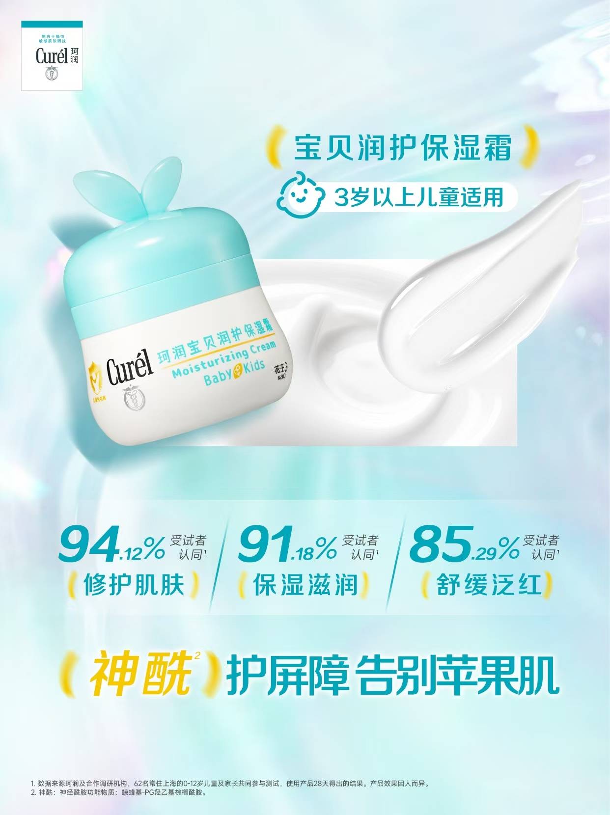 在为成人干敏肌1提供贴心保湿方案的同时,珂润同样温柔守护宝宝们的娇嫩肌肤。秋冬季节气候干燥,宝宝皮肤屏障尚未发育完善,更易受外界环境影响,出现多种不适问题。针对宝宝肌肤的特殊性,珂润专门研发了宝贝润护保湿霜(昵称“珂润云朵霜”),为宝宝的肌肤健康筑起防护墙。它以神经酰胺功能物质2为核心成分,温和修复宝宝受损的皮肤屏障。同时添加尿囊素与植物由来的角鲨烷,尿囊素可舒缓肌肤不适,植物角鲨烷温和安全,保湿锁水效果出色,让宝宝肌肤保持水润柔嫩。