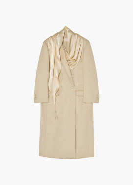 粗纺双面呢H型长款大衣 以流畅的H型轮廓塑造修长身形,精选质感柔软的粗纺双面呢料,完美平衡保暖性与轻盈感。可拆卸全真丝围巾成为点睛之笔,丝质流光与羊绒质感形成精妙对撞,可随心系出不同造型,为女性提供更多自由搭配的可能性。