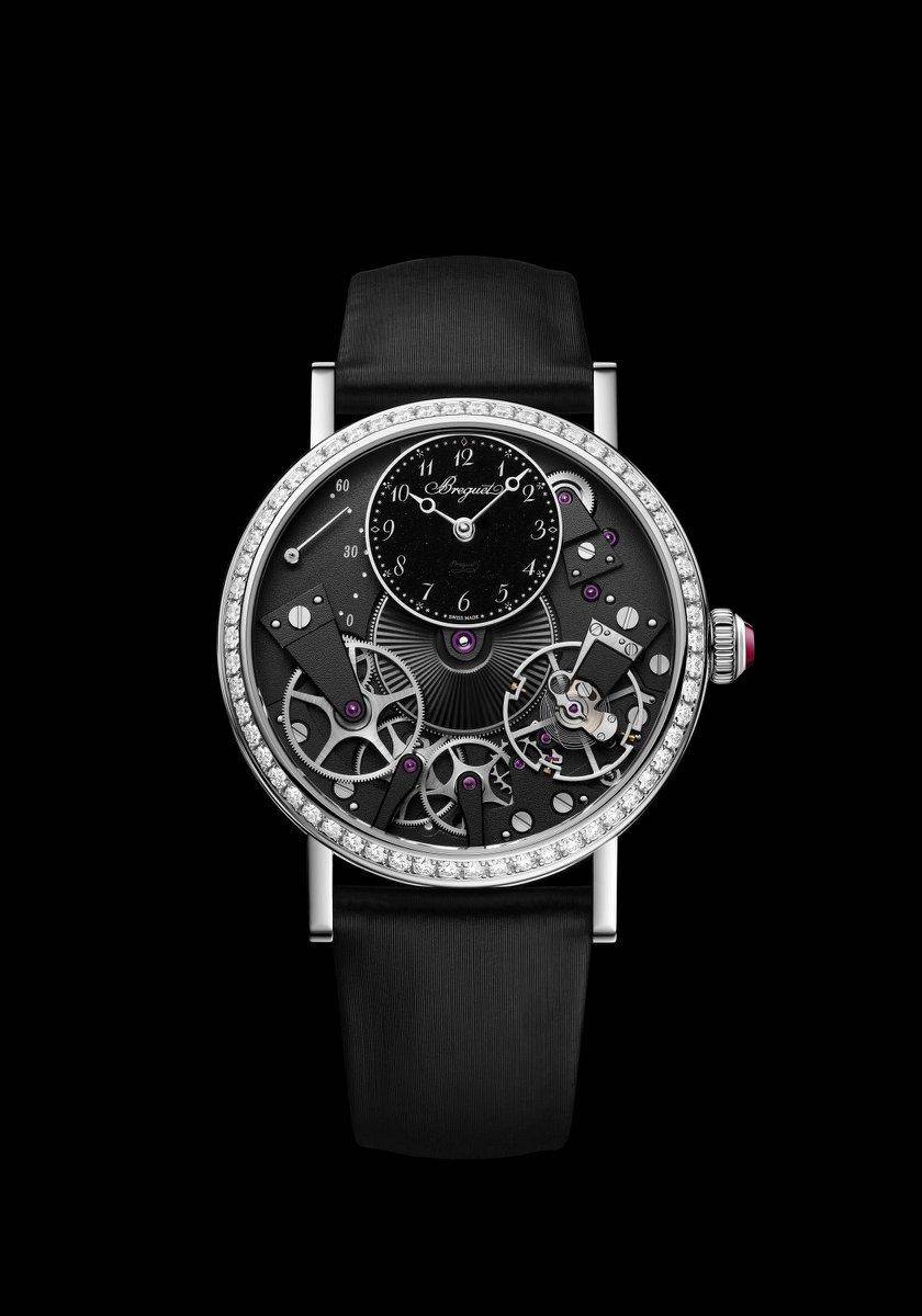 宝玑首度为 Tradition 传世系列时计搭配黑色砂金石表盘,搭配精致的银色时标,在视觉上为整体设计增添微妙的深邃层次感。