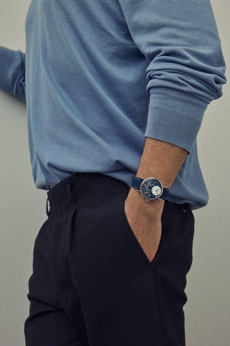 此外,时计采用偏心表盘设计,其灵感源自触摸表。机芯的整体布局亦与此经典之作一脉相承。触摸表由制表大师宝玑先生于 1795 年制作,并于 1799 年开始发售。其本身设计亦沿袭早期问世的 Souscription 预定怀表。